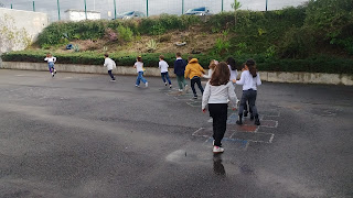 Antes de voltar à sala, criámos um cordão gigante para assinalar este Dia da Erradicação da Pobreza antecipado. O cordão dava voltas e voltas pelo recreio e só se desfez quando a chuva mais forte começou a cair.